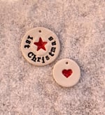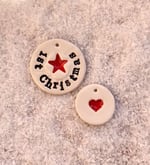 The 1st Christmas tag is 4cm in diameter and the red heart tag is 3 cm in diameter. I have attached some twine for you to use.