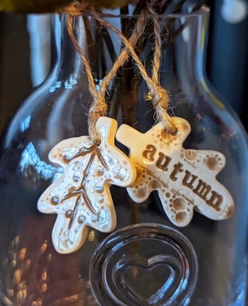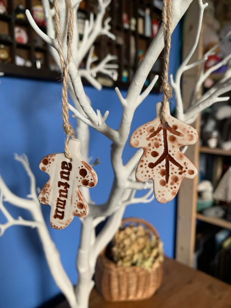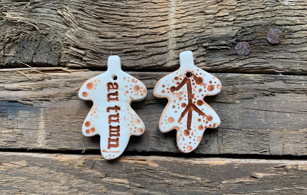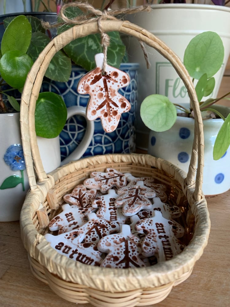 I cut out the leaves, emboss them, they are allowed to dry, I then colour with underglaze and fire them in my kiln. Then I clean them up, glaze them and fire again in my electric kiln.