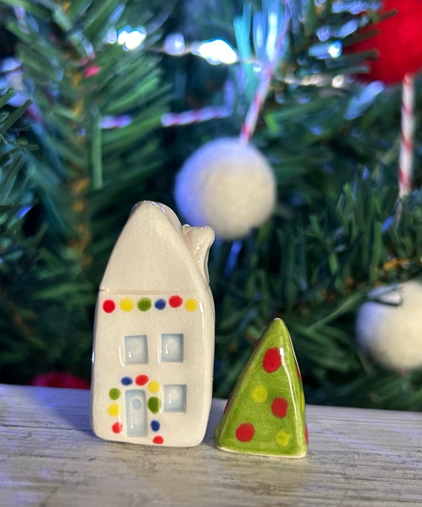 I make the houses, they are allowed to dry, I then colour with underglaze and fire them in my kiln. Then I clean them up, glaze them and fire again in my electric kiln.