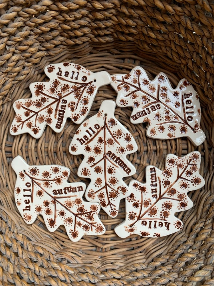 I cut out the leaves, then I stamp the lettering and motif, they are allowed to dry, I then colour with underglaze and fire them in my kiln. Then I clean them up, glaze them and fire again in my electric kiln.