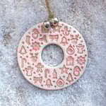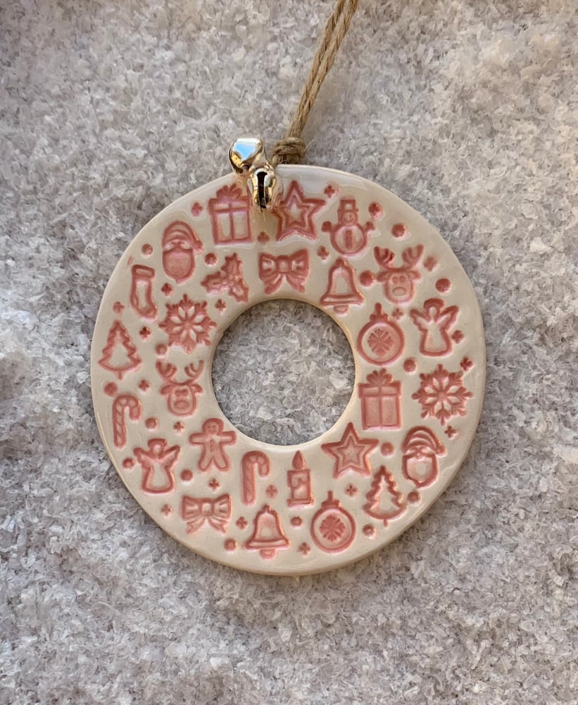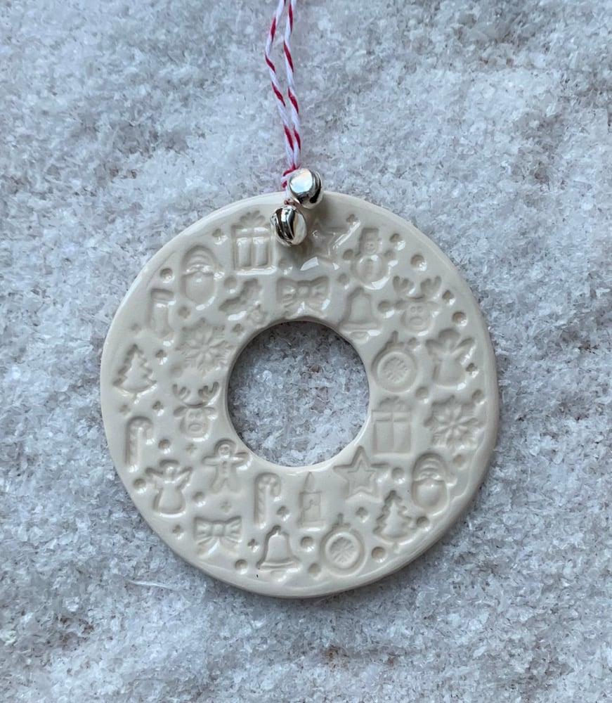 These Christmas Wreaths are handmade with white earthenware clay and shiny glaze. The Christmas Wreath are approx 7.7cm diameter.