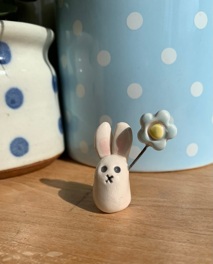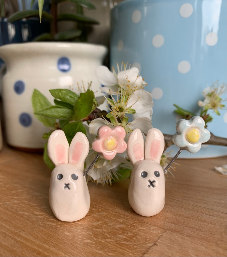 Hand Made Ceramic Cute Bunny holding a pastel Flower. This is a listing for one bunny.