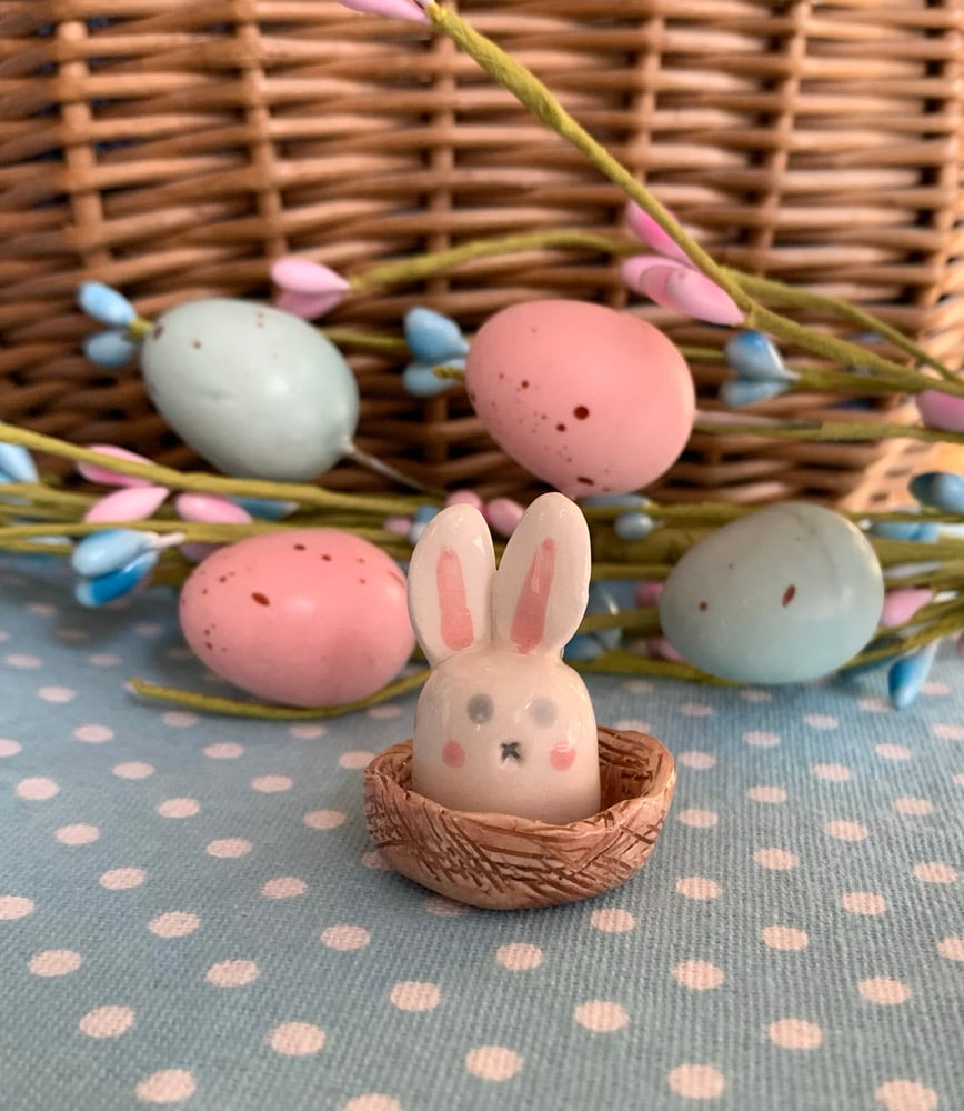 These little Bunnies are handmade with white earthenware clay and shiny glaze. The little Bunnies in a basket are are approx. 2.5cm wide and 3cm tall (some are smaller, and some are taller) but all are cute. The Bunny does not come out of the basket.