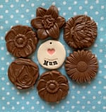 I cut out the tags, then I stamp the lettering and motif, they are allowed to dry, I then colour with underglaze and fire them in my kiln. Then I clean them up, glaze them and fire again in my electric kiln.