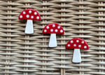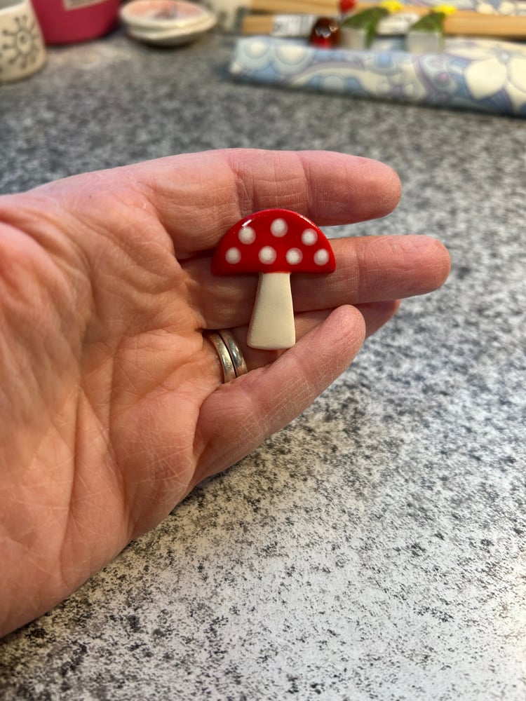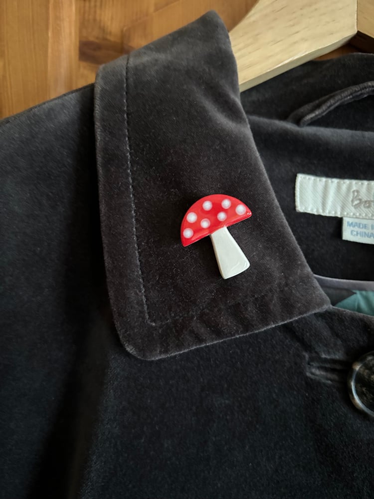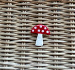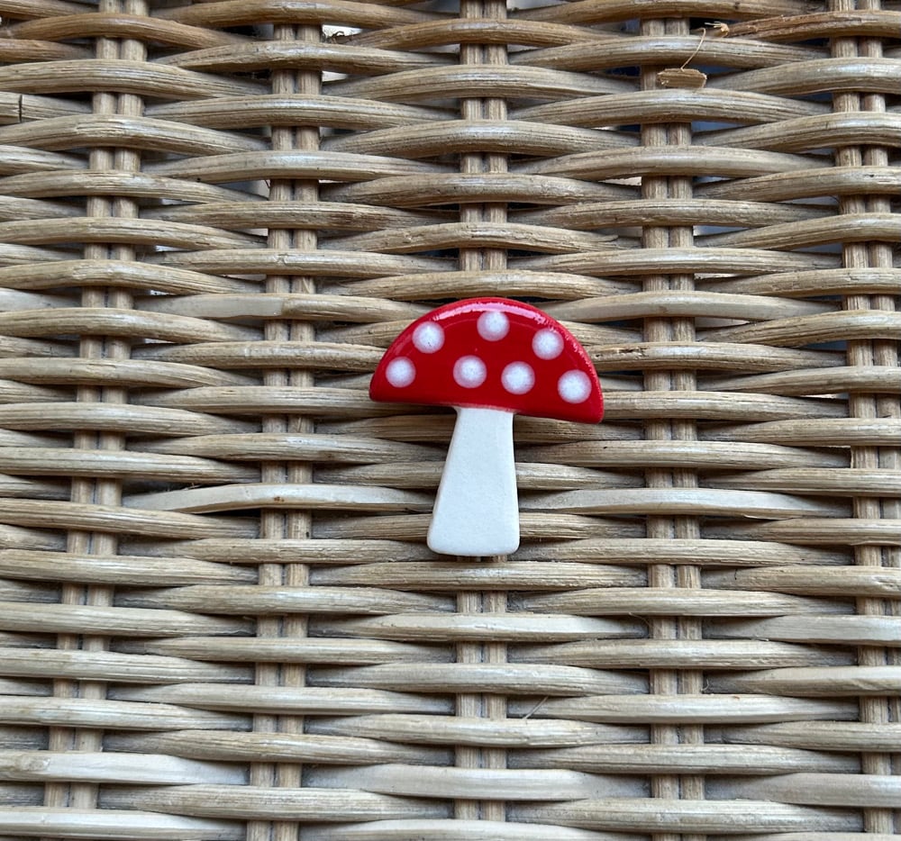 Handmade Ceramic Toadstool Brooch. The Toadstool Brooch is 3cm tall and 2.5cm wide. It has a brooch fastening securely attached to the back.