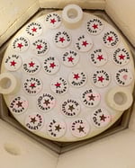 I cut out the tags, then I stamp the lettering and motif, they are allowed to dry, I then colour with underglaze and fire them in my kiln. Then I clean them up, glaze them and fire again in my electric kiln.