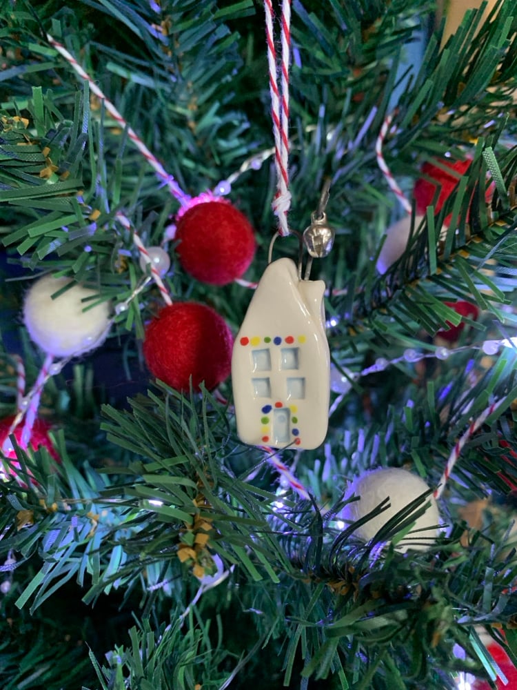 I make the houses, they are allowed to dry, I then colour with underglaze and fire them in my kiln. Then I clean them up, glaze them and fire again in my electric kiln.