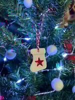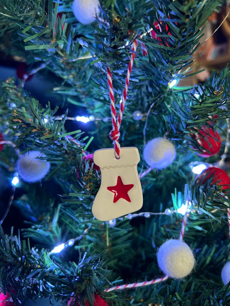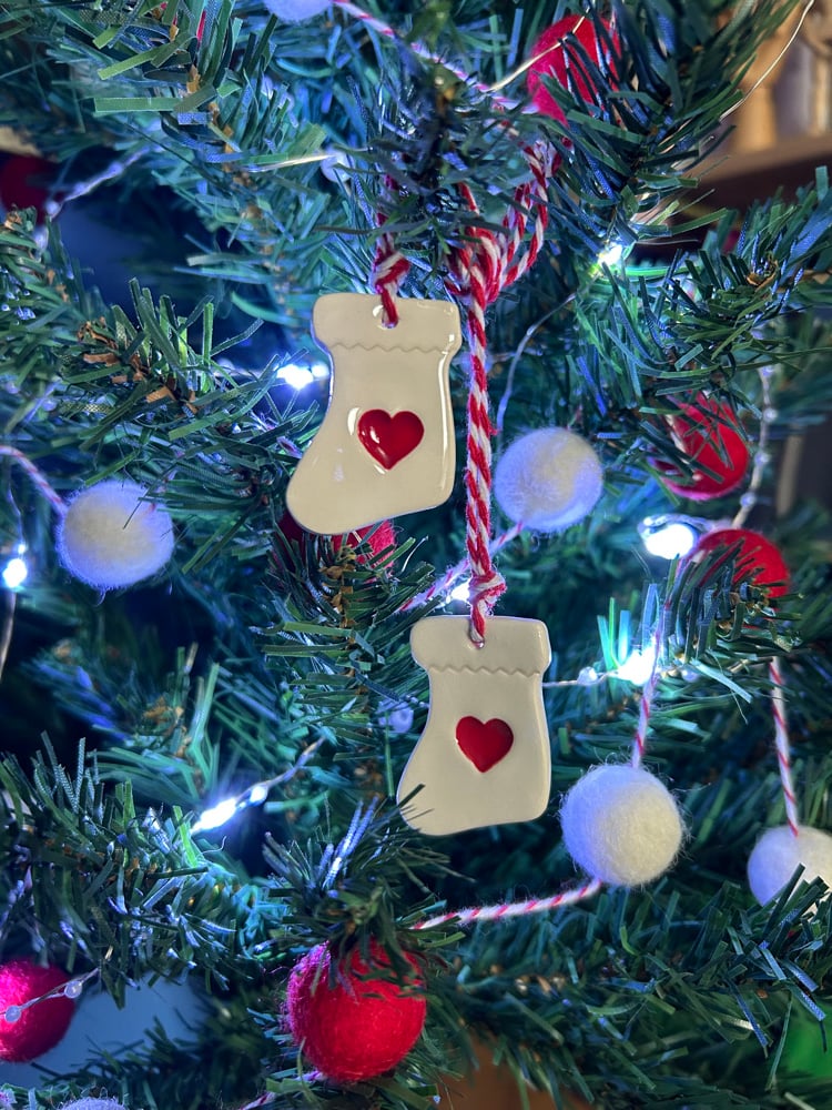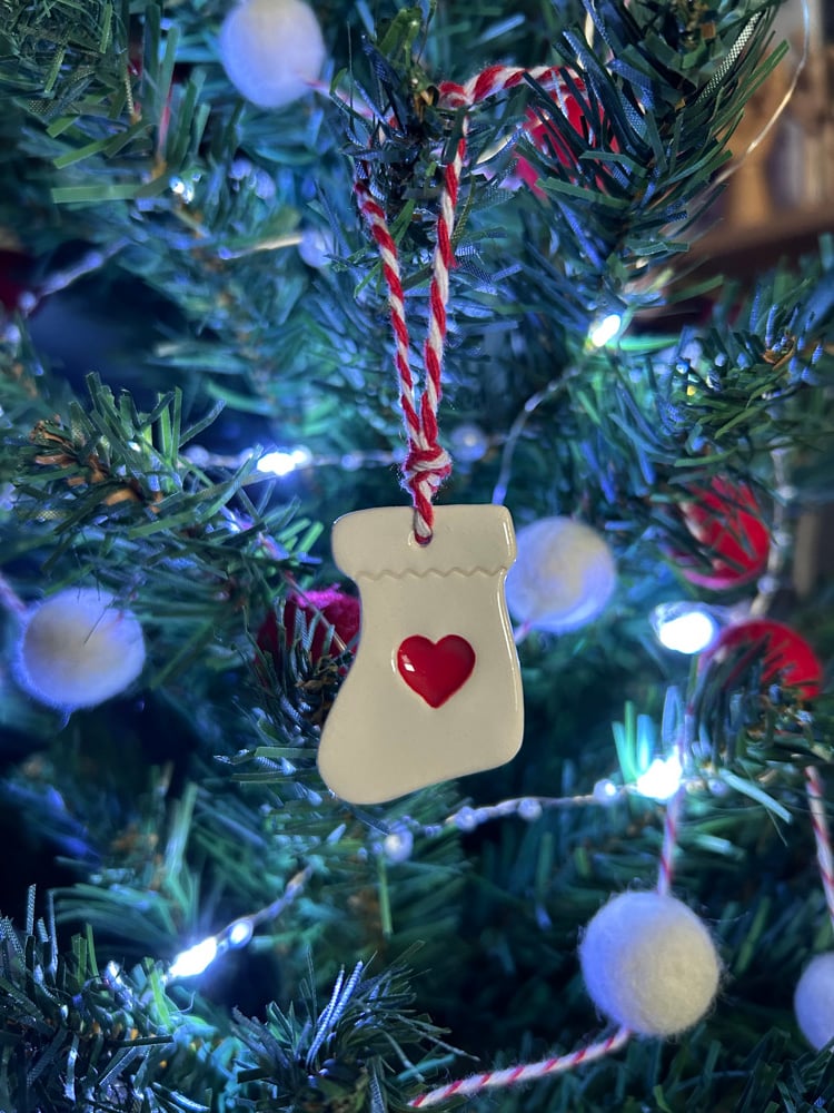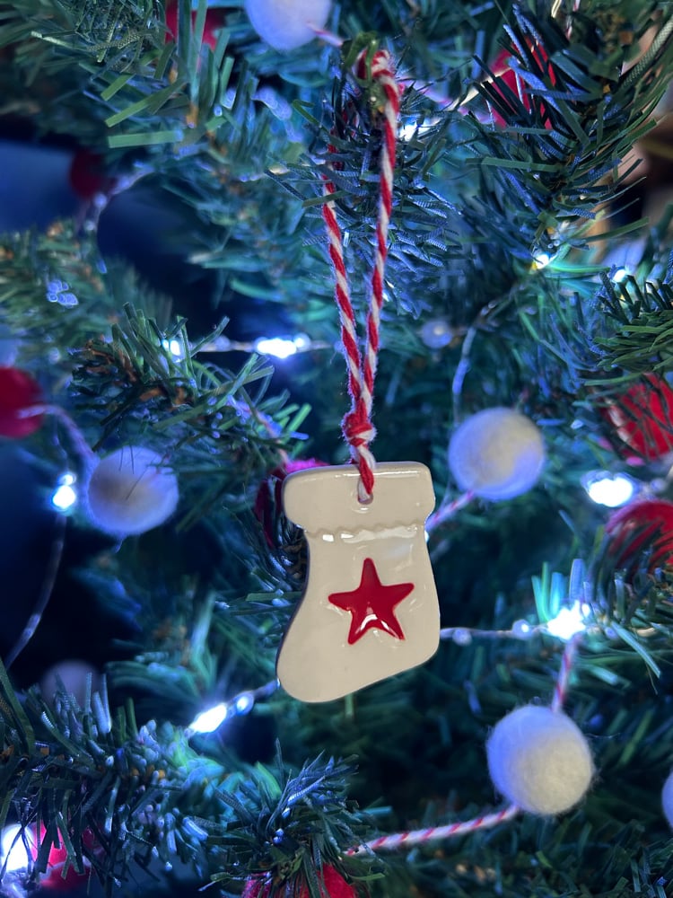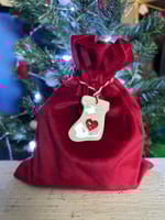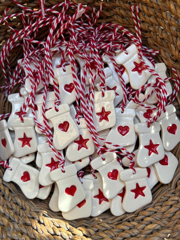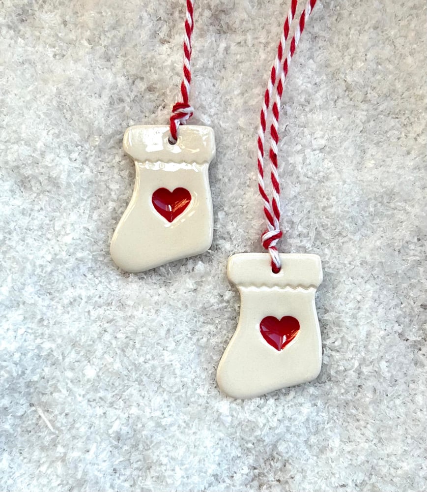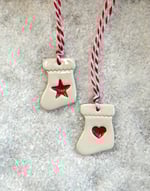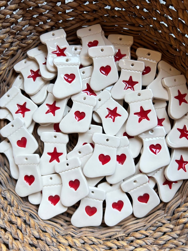 These Christmas Stockings are handmade with white earthenware clay and shiny glaze. The Stocking decoration is approx 3.5cm tall and 3cm wide.
