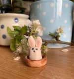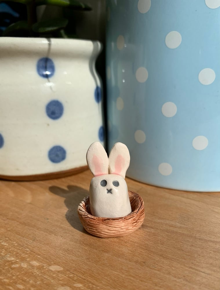 These little Bunnies are handmade with white earthenware clay and shiny glaze. The little Bunnies in a basket are are approx. 2.5cm wide and 3cm tall (some are smaller, and some are taller) but all are cute. The Bunny does not come out of the basket.