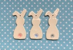 The Floppy Ear Bunny is 8cm tall and 3.5cm wide. The Side view Bunny is 8cm tall and 5cm wide. I have attached some twine for you.