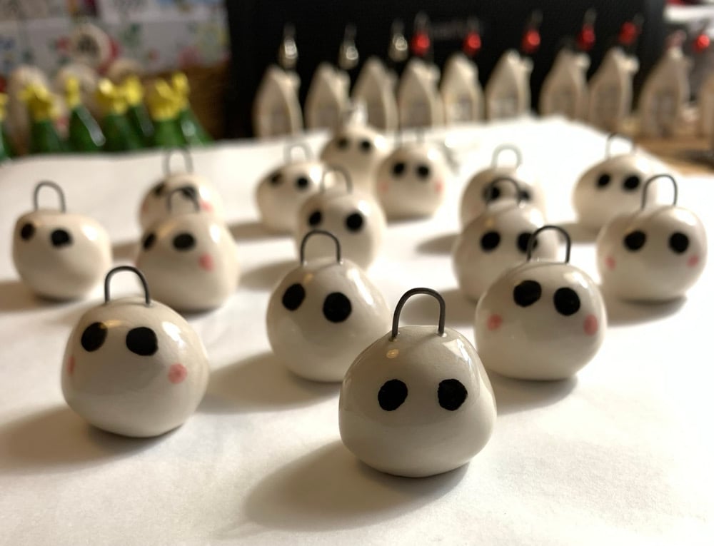 I make the Snowballs, they are allowed to dry, I then colour them with underglazes and fire them in my kiln. Then I clean them up, glaze them and fire again in my electric kiln.