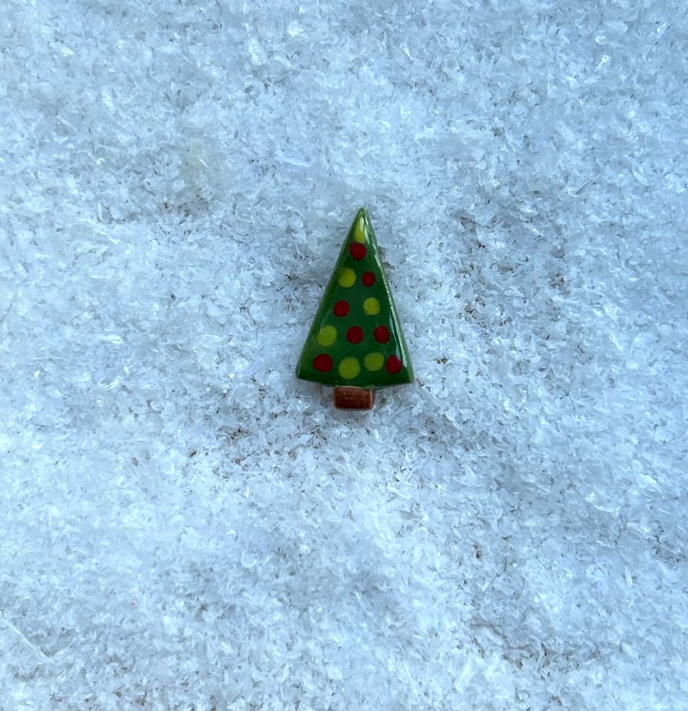 Handmade Ceramic Little Christmas Tree Brooch. The Christmas Tree Brooch is 3cm tall and 1.5cm wide. It has a brooch fastening securely attached to the back.